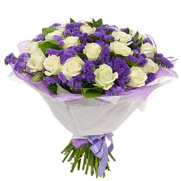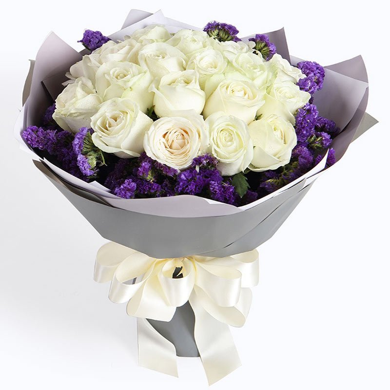 White roses carry universal symbolism: purity, new beginnings, remembrance, and reverence. Purple limonium also known as sea lavender or statice represents sympathy, success, and lasting beauty, making this pairing one of the most versatile and emotionally resonant arrangements in Kaiflora‘s collection.
